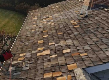 Most homeowners arrive here because something on their cedar roof caught their eye — a slipped shingle, a thinning or split area, a ridge cap that shifted after a storm, or a water stain after wind-driven rain.